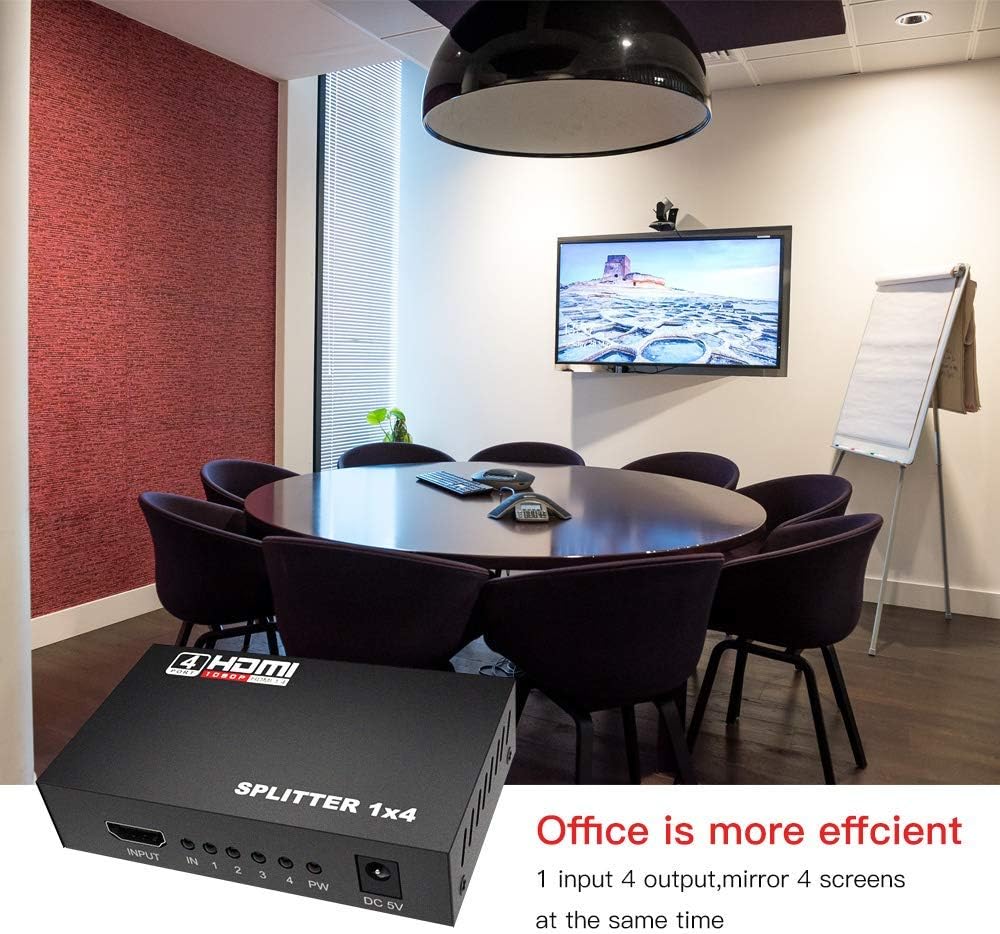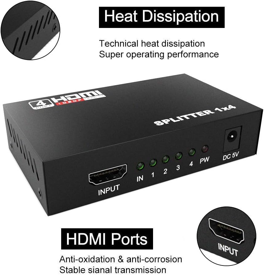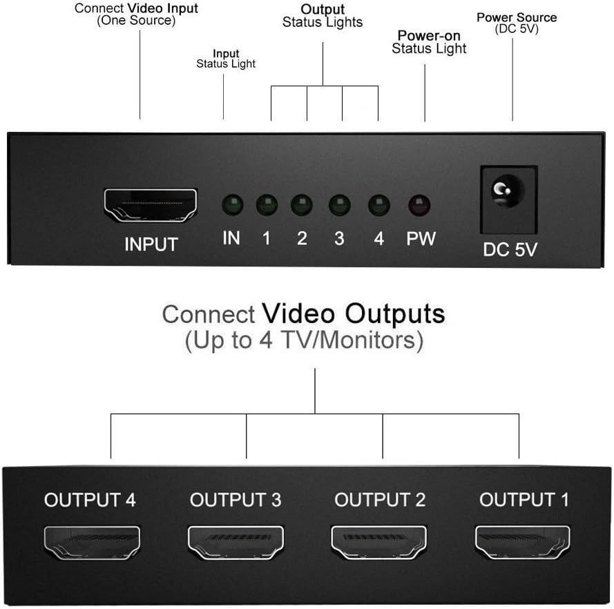 • Easy to use- This 4K 1 in 4 out HDMI splitter is easy to operate, split 1 HDMI input signal to 4 HDMI output signals all are identical easy to use, takes only seconds to install